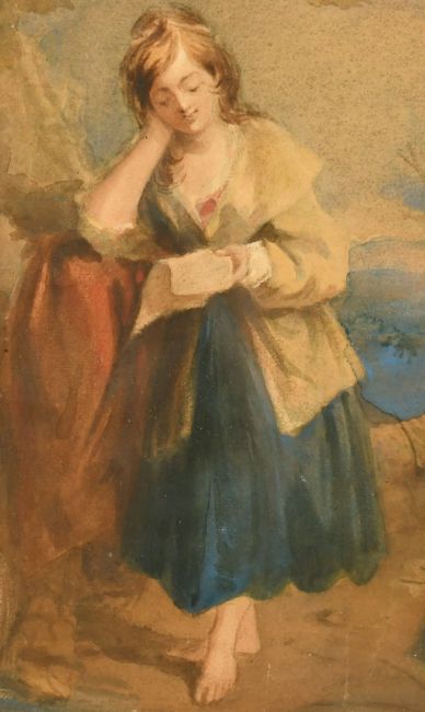 19th Century English School, a young lady reading a letter leaning against a rock, watercolour, 8.5" x 5".
