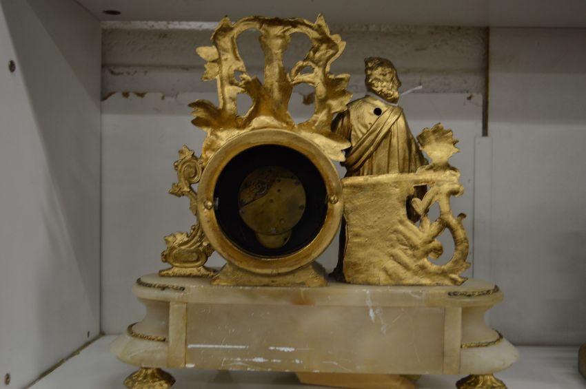 A French decorative gilt metal and alabaster mantle clock.