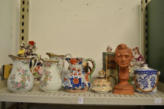 Decorative china to include Masons ironstone jug, graduated set of three Indian Tree pattern jugs, Staffordshire figure, terracotta bust etc.