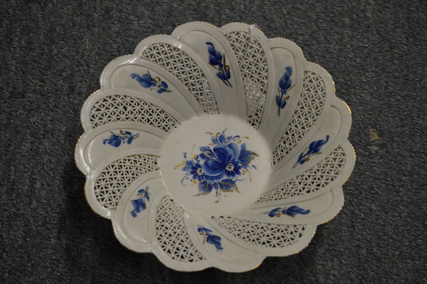 A small porcelain basket with pierced sides (cracked).
