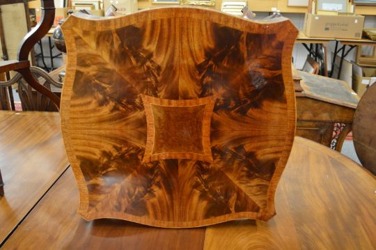 A good pair of mahogany and inlaid two tier occasional tables of shaped square outline on curving legs.