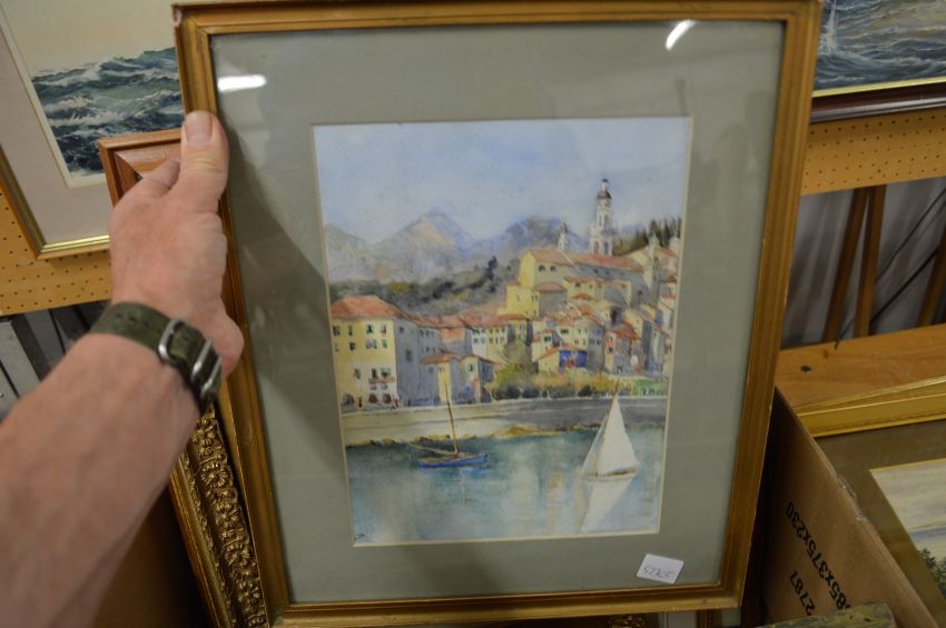 A box of various pictures to include watercolours, prints and engravings.