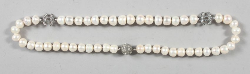 A GOOD CHANEL PEARL AND DOUBLE 'C' NECKLACE. 48 pearls, 24ins long in a black Chanel box..