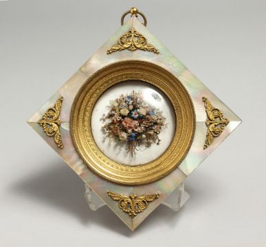 A SUPERB PALAIS ROYAL FRAMED MINIATURE BOUQUET OF FABRIC FLOWERS in a mother of pearl frame, with gilt metal mounts.