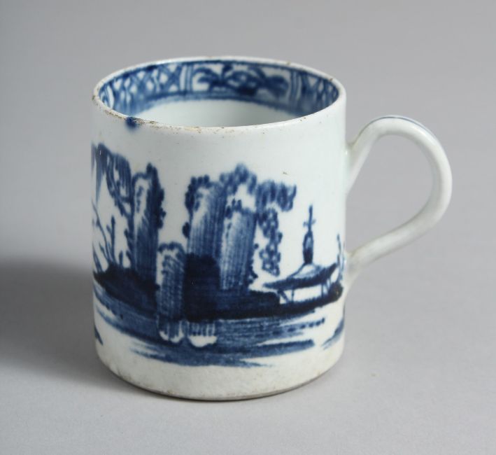 A BOW COFFEE CUP painted in underglaze blue with tall rocks and a bridge.