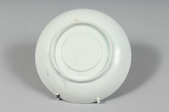 A BOW CHOCOLATE CUP AND SAUCER, the cup of flared beaker shape with two ornately moulded handles, both painted with flowers in lobed panels, on a powder blue ground.