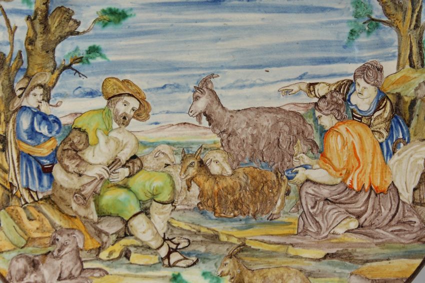 A LARGE ITALIAN FAIENCE CIRCULAR CHARGER as a man playing pipes, three girls and goats.
