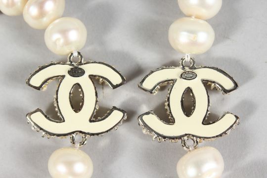 A GOOD CHANEL PEARL AND DOUBLE 'C' NECKLACE. 65 pearls, 28ins long in a black Chanel box.