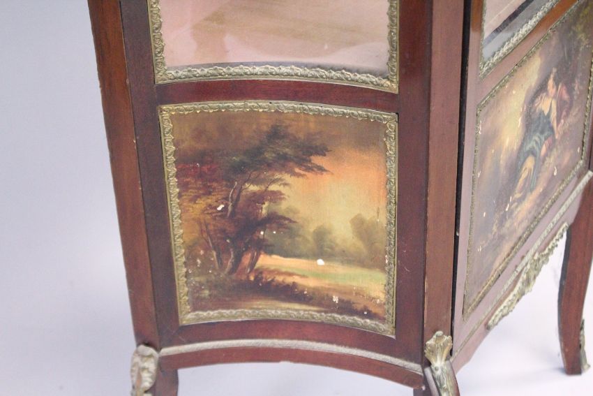 A SMALL LOUIS XVI STYLE VITRINE with brass grill and painted glass sides, on curving legs.