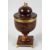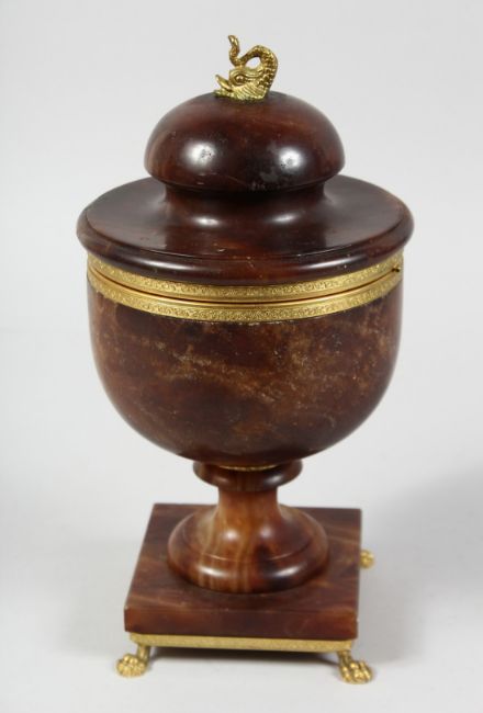 A REGENCY STAINED ALABASTER URN AND COVER with hinged lid on claw feet.