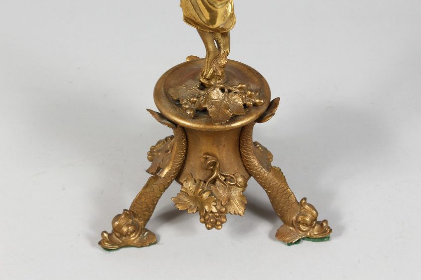 A GOOD 19TH CENTURY FRENCH GILDED BRONZE CANDELABRA with a classical female figure holding three scrolling branches on three dolphin feet.