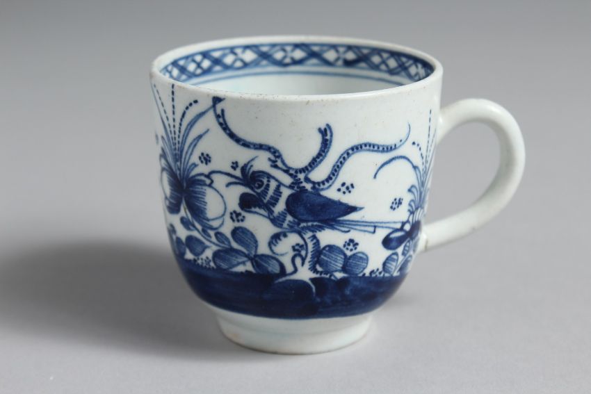 A BOW COFFEE CUP painted with a bird and flowers, the interior with a diaper border.