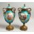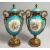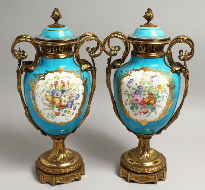 A VERY GOOD PAIR OF 19TH CENTURY SEVRES PALE BLUE, TWO HANDLED URNS AND COVERS, painted with reverse oval scenes, figures and flowers with rich ornate mounts and pineapple finials.
