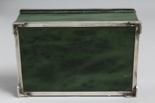 A SUPERB RUSSIAN SILVER AND JADE JEWEL BOX with Russian eagle and precious stones supported on bracket feet.