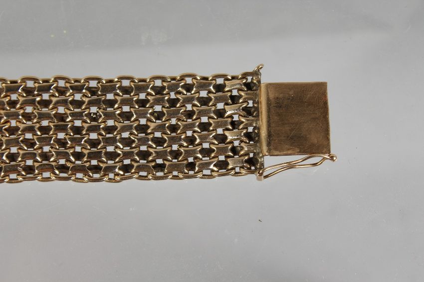 A GOOD WIDE FLEXIBLE GOLD BRACELET.