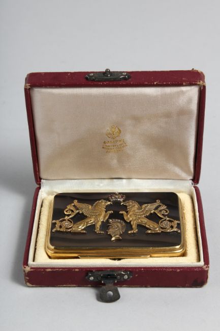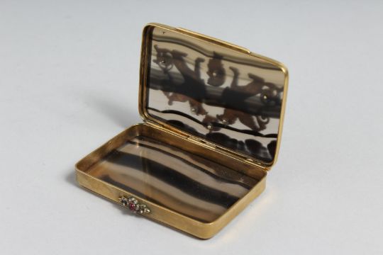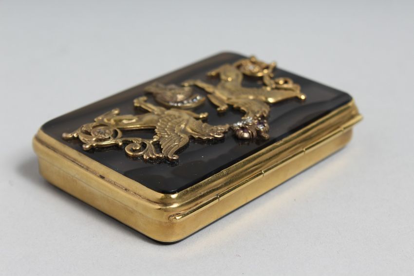 A SUPERB RUSSIAN SILVER GILT, AGATE AND DIAMOND SET BOX. The lid fitted with winged animals, crown and head.