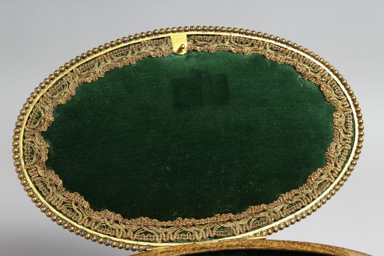 A RARE BLACK FOREST OVAL CARVED WOOD AND GILT JEWEL BOX the top with large floral carved wood panels, six circular floral panels and supported on gilt claw feet.