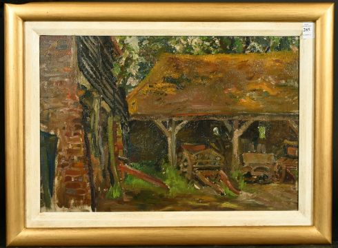 EARLY 20TH CENTURY SCHOOL. An old farm barn with carts and old car, oil on canvas, 14" x 20".