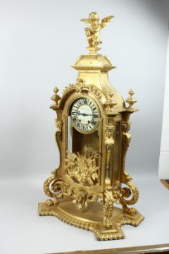 A SUPERB 19TH CENTURY FRENCH ORMOLU MANTLE CLOCK BY RAINGO, PARIS, the eight day movement striking on a bell, with porcelain dial and separate numerals, in an ormolu case mounted with cupids holding an hour glass, the corners as females caryatid figures, the glazed door mounted with a horse drawn chariot on legs and harebell supports with four feet, the whole on a shaped platform base.