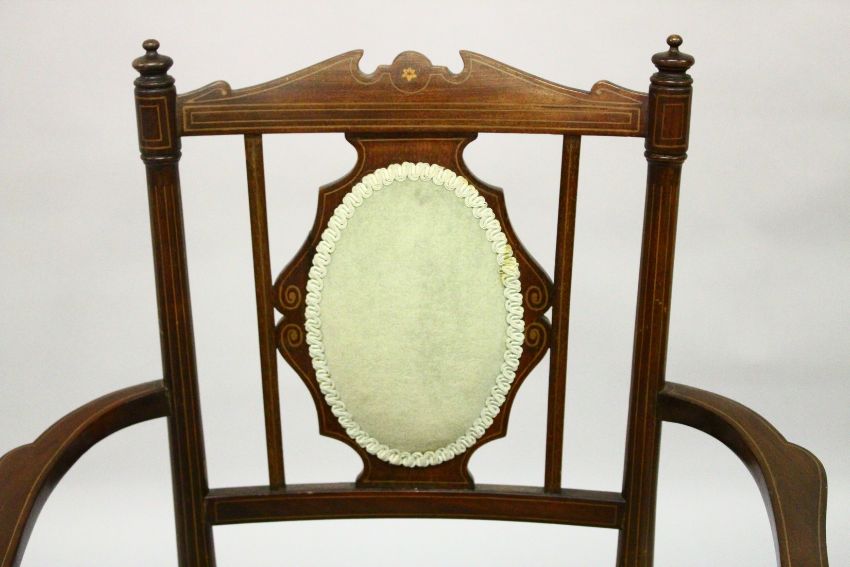 AN EDWARDIAN MAHOGANY INLAID ARMCHAIR with padded back and seat.