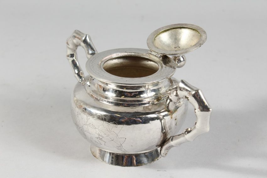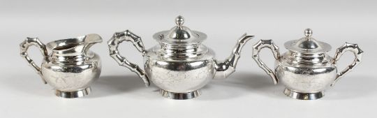 A CHINESE SILVER TEA SET engraved with birds with bamboo pattern handles and spout, comprising TEAPOT, sugar basin and milk jug.