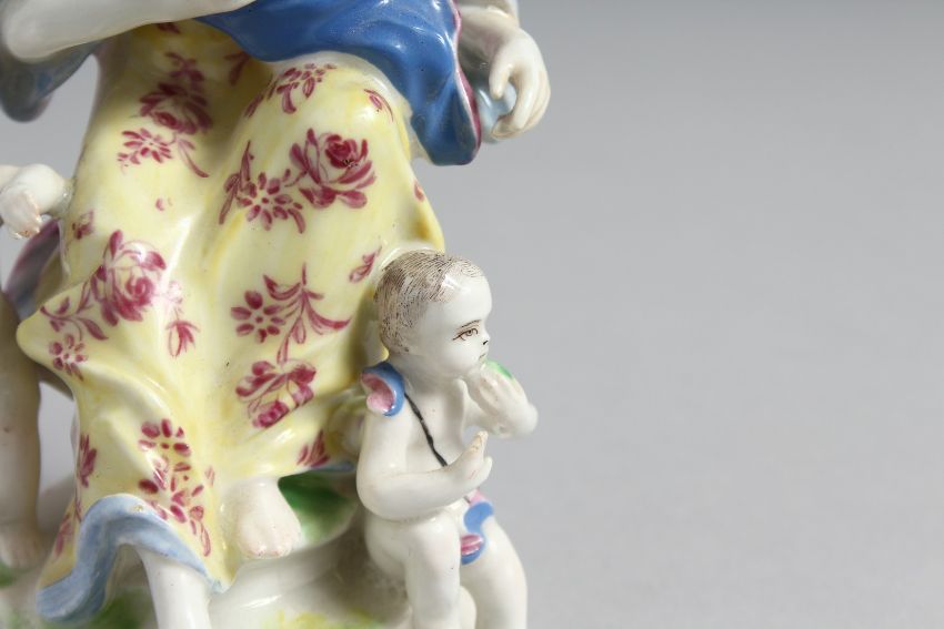 A VERY RARE BOW FIGURE GROUP emblematic of Charity, modelled as a mother seated breast-feeding an infant, two further children nearby.