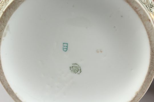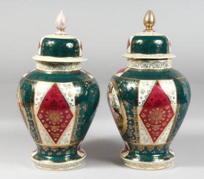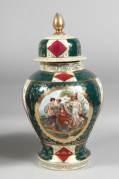 A LARGE PAIR OF VIENNA BULBOUS VASES AND COVERS painted with figures in a classical panel.