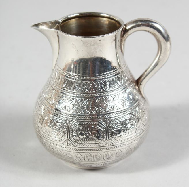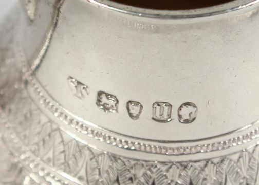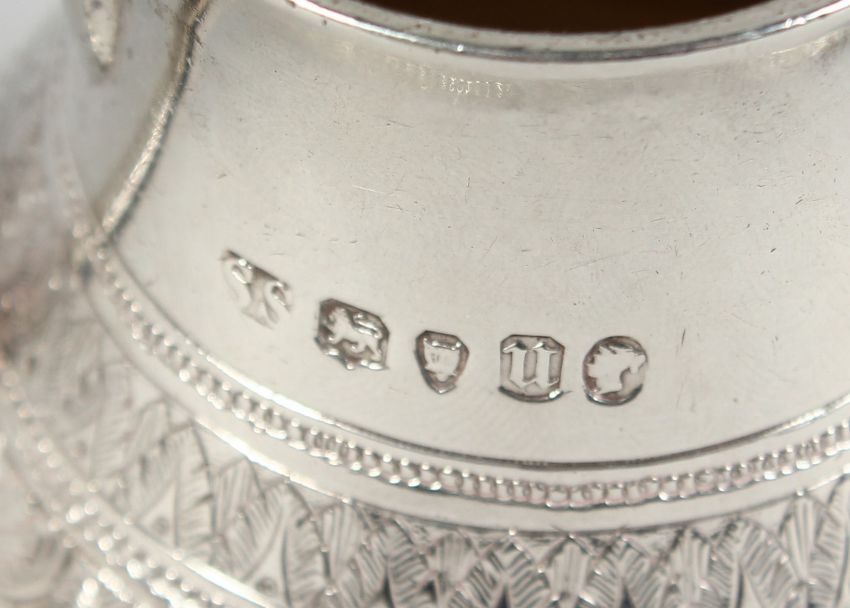 A GOOD VICTORIAN GOLDSMITH ALLIANCE BATCHELOR’S TEA SET with engraved decoration, comprising TEAPOT, sugar bowl and milk jug with sugar tongs.