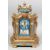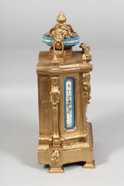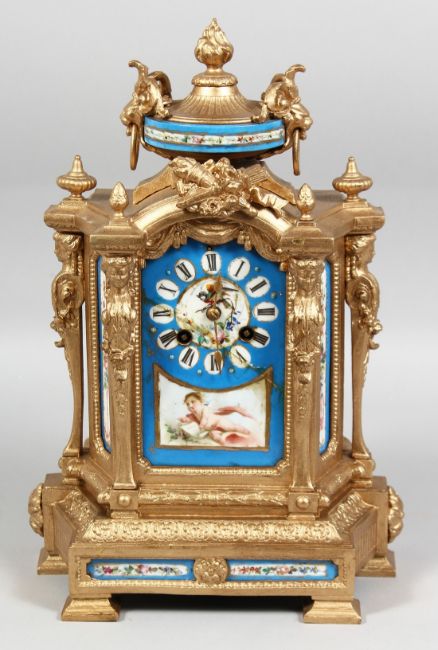 A GOOD 19TH CENTURY FRENCH GILT METAL AND SEVRES PORCELAIN PANEL CLOCK with blue dial painted with a bird and cupid, floral panels to the side. 14ins high.