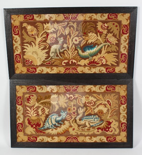 A PAIR OF 19TH CENTURY GROS POINT CHINOISERIE DESIGN EMBROIDERY, framed and glazed.