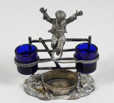 A VICTORIAN METAL DOUBLE SALT, a young boy jumping a style.