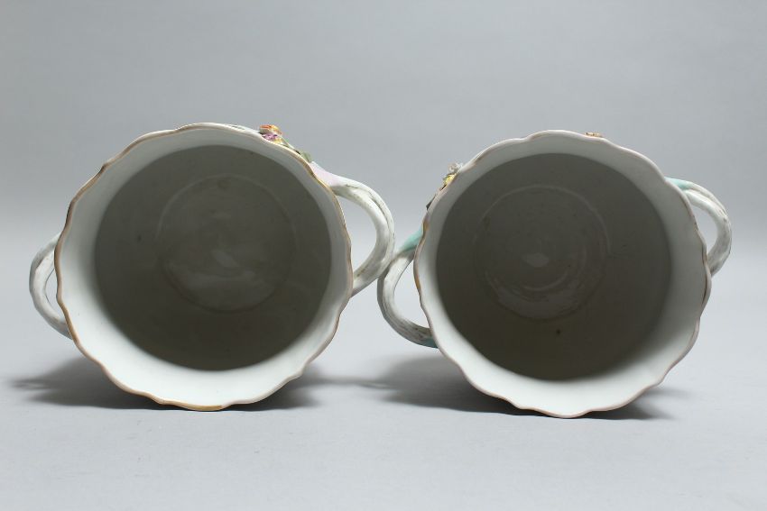 A GOOD PAIR OF DRESDEN PORCELAIN TWO HANDLED CACHE POTS painted and encrusted with birds and flowers.