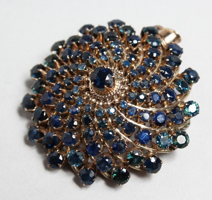 A VERY GOOD SAPPHIRE AND GOLD BROOCH.