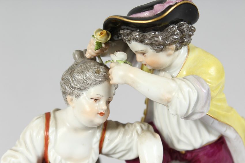 A GOOD MEISSEN PORCELAIN GROUP OF A BOY AND GIRL with garlands of flowers on an oval base.