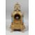 A GOOD 19TH CENTURY FRENCH GILDED METAL THREE PIECE GARNITURE with painted porcelain panels. Clock 16ins high. Pair of urns 12.5ins high.
