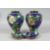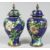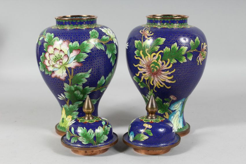 A PAIR OF CHINESE BLUE GROUND CLOISONNE URNS AND COVERS, decorated with birds, butterflies, and native flora. 27cm high