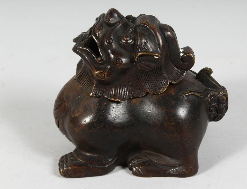 A CHINESE BRONZE FOO-DOG FORMED CENSER AND COVER. Mark to base. 13cm long