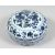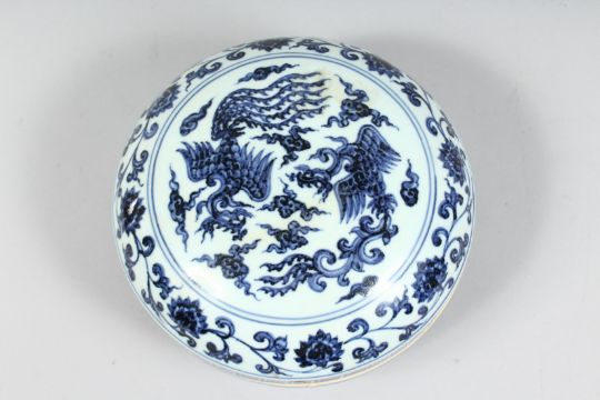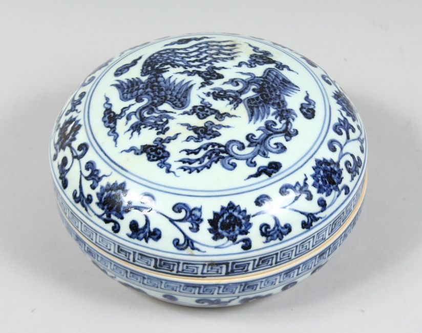 A CHINESE BLUE AND WHITE PORCELAIN CIRCULAR BOX AND COVER, decorated with phoenix and lotus, the rim of cover bearing a six character mark, 21cm diameter.
