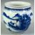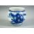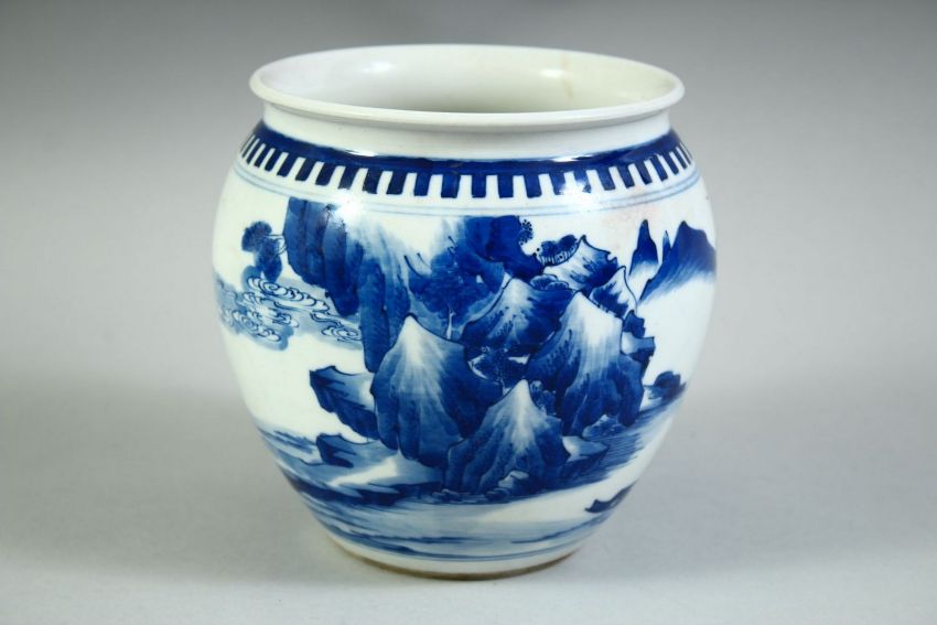 A SMALL CHINESE BLUE AND WHITE PORCELAIN PLANTER, painted with a mountainous river landscape, the base with six character mark, 13cm high.
