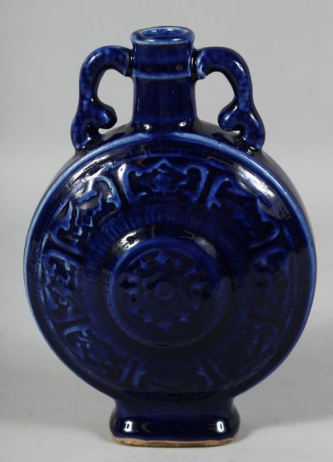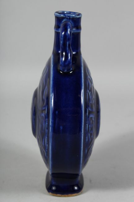 A CHINESE SACRIFICIAL BLUE GLAZE TWIN-HANDLED PORCELAIN MOON FLASK. 20.5cm high