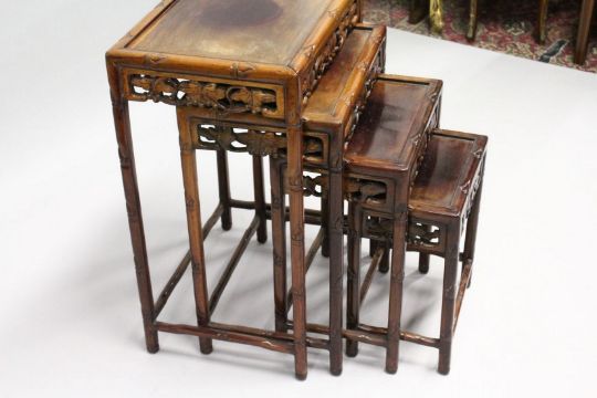 A GOOD NEST OF FOUR CHINESE HARDWOOD RECTANGULAR TABLES, with faux bamboo carved frames, fruiting vine carved frieze on stretchered legs, largest 50cm wide, 36cm deep, 72cm high (4).