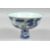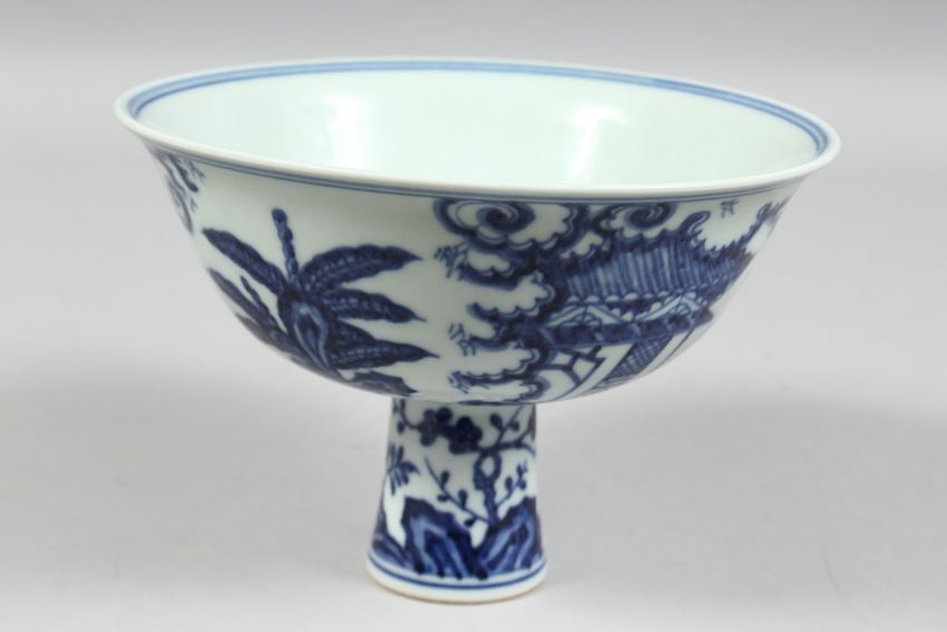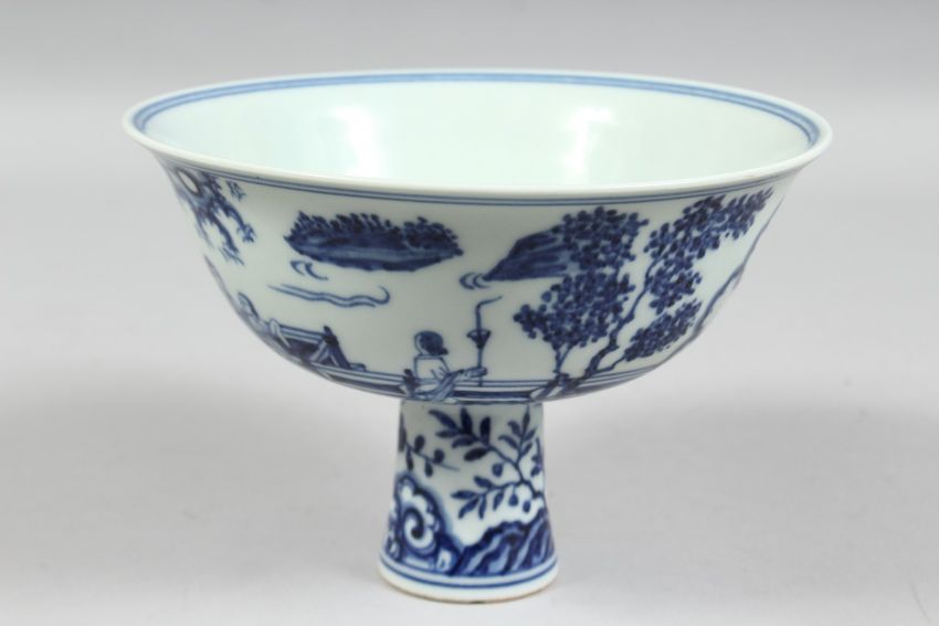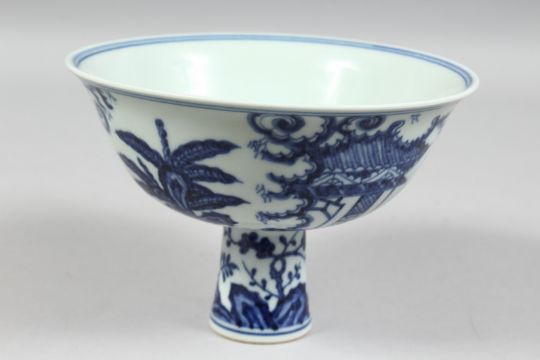A CHINESE BLUE AND WHITE PORCELAIN STEM CUP, the exterior decorated with female figures in a garden setting, the interior of the bowl with six-character mark. Bowl diameter 17.5cm
