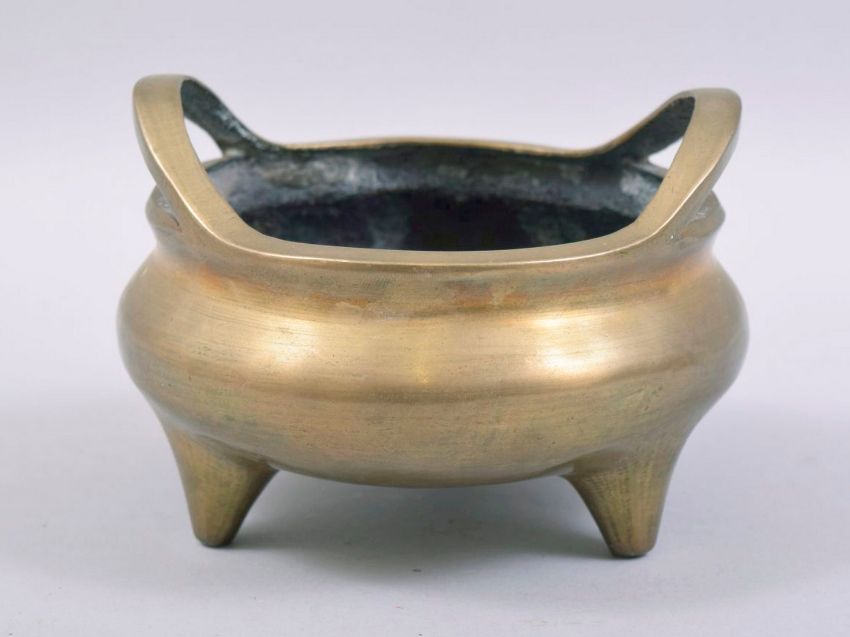 A GOOD CHINESE BRASS TWIN HANDLE TRIPOD CENSER, the base with mark, 14cm diameter.