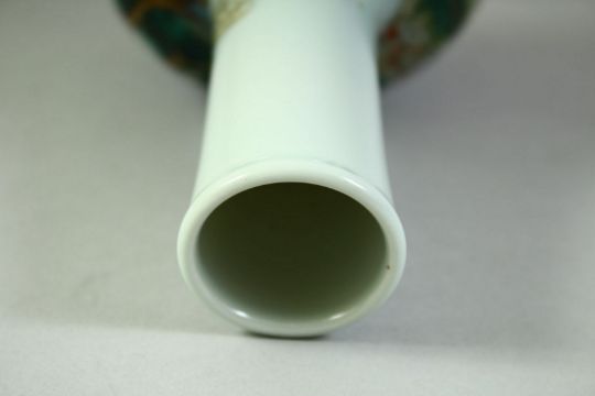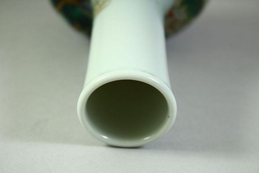 A CHINESE FAMILLE VERTE PORCELAIN BOTTLE VASE, painted with a figure and children in an outdoor setting, the reverse with calligraphy, 18.5cm high.