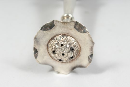 A LARGE INDIAN SILVER ROSEWATER SPRINKLER, the body with embossed floral decoration, the sprinkler in the form of a flower head, 29cm high.