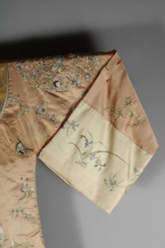 A 20TH CENTURY CHINESE EMBROIDERED SILK ROBE, finely embroidered with native flora, butterflies and birds, the reverse in full colour (with no light damage), 105cm from collar to skirt.