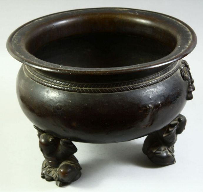 A VERY LARGE CHINESE BRONZE TRIPOD CENSER, the feet formed as crouching figures holding the censer aloft, 37cm diameter.