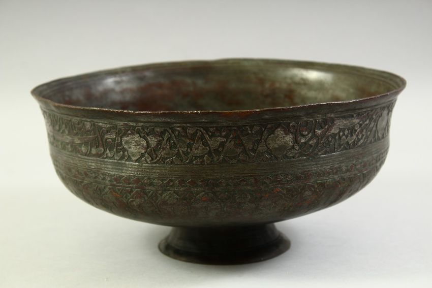 AN ISLAMIC TINNED COPPER PEDESTAL BOWL, with a band of engraved calligraphy to the rim. Possibly signed to the underside. 26cm diameter