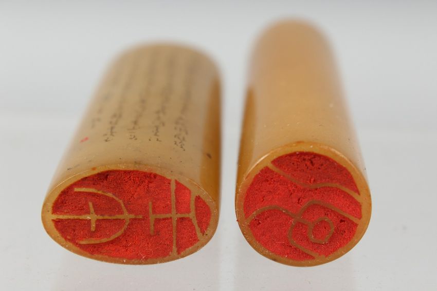 TWO CHINESE HARDSTONE SEALS WITH FINE INSCRIPTIONS TO THE SIDES. 8.5cm and 7.5cm long
