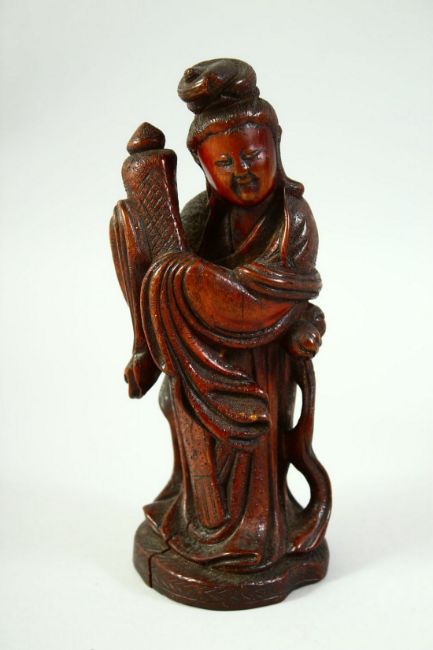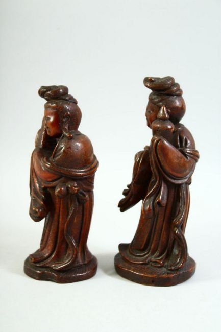A PAIR OF CHINESE CARVED WOOD FEMALE FIGURES, 22cm and 21cm.